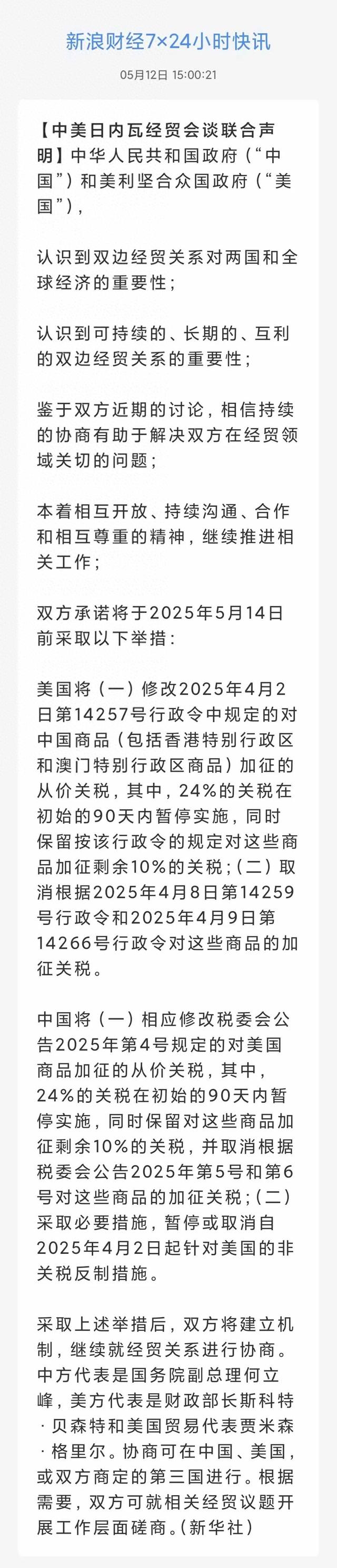 具体来看声明内容,中美双方同意保留10%的关税,另外,24%的关税在初始的90天内暂停实施,其它91%的关税全部取消。